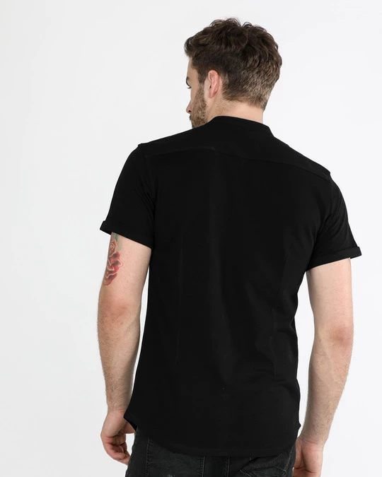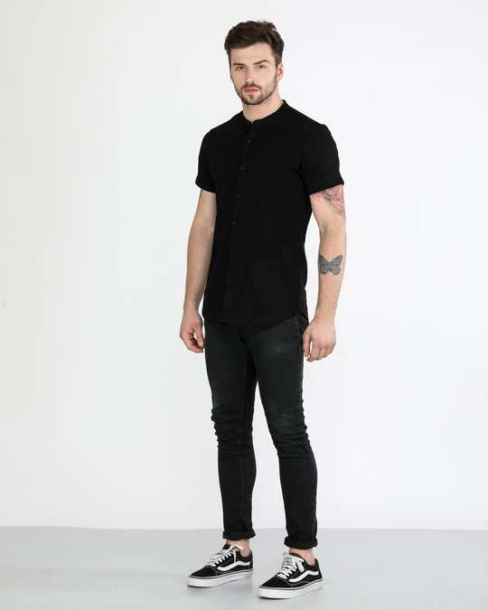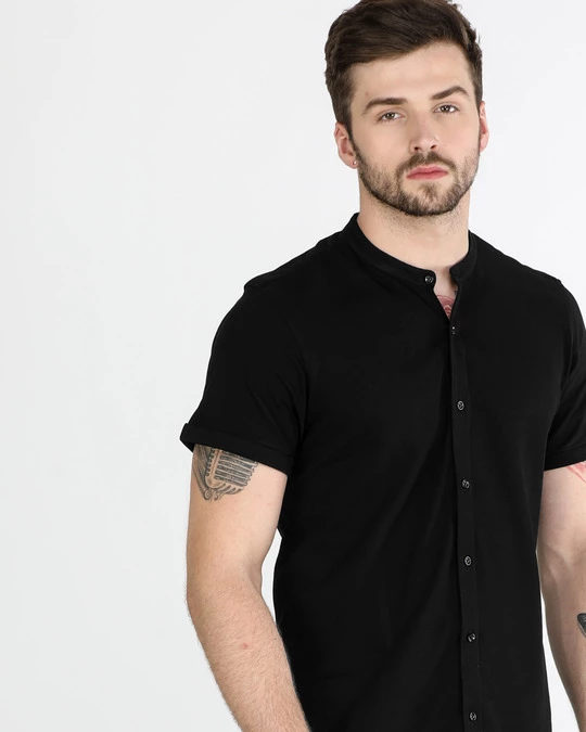 Jet Black Mandarin Collar Pique Shirt